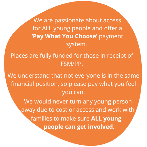 We are passionate about access for ALL young people and offer a ‘Pay What You Choose’ payment system. Places are fully funded for those in receipt of FSM/PP.